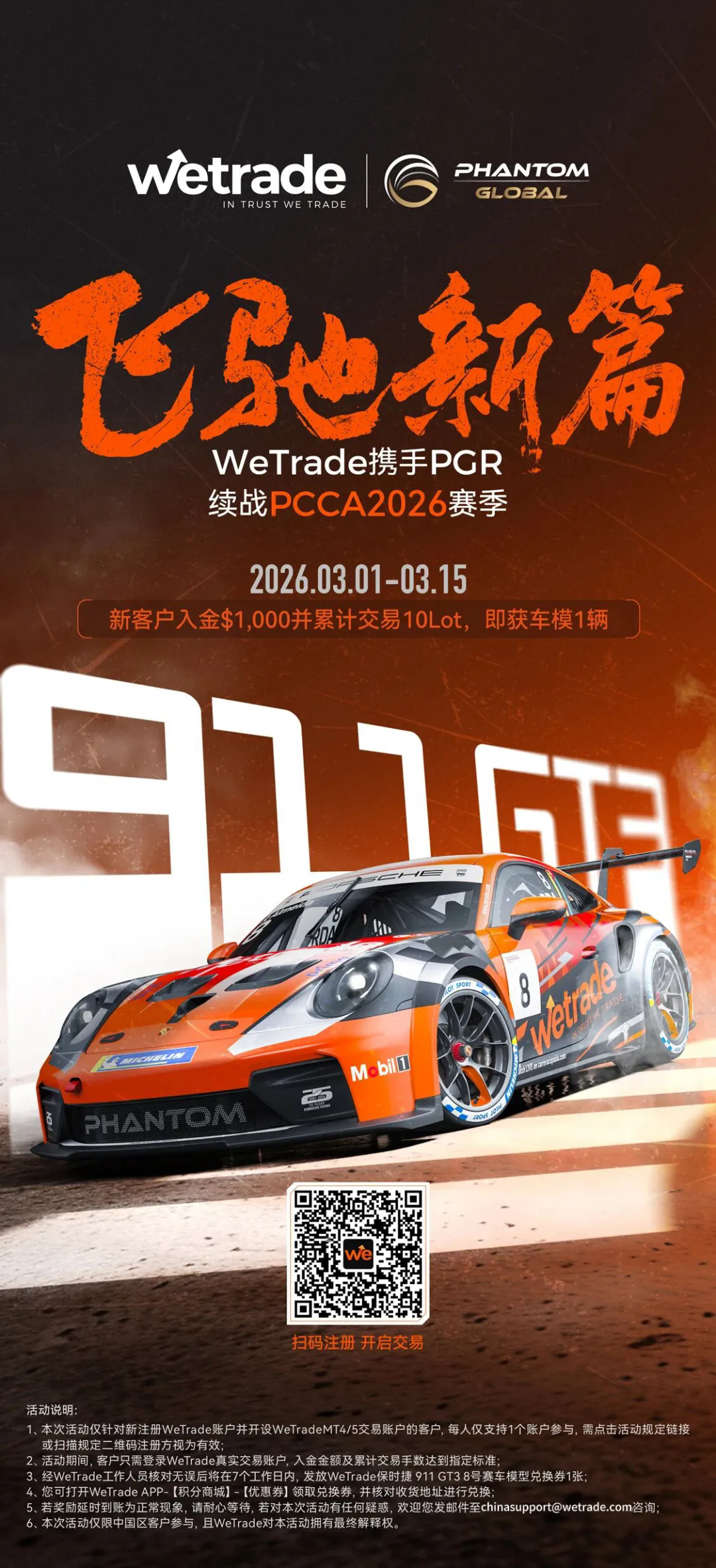 活動規(guī)則:新客戶入金滿 $1,000 并累計交易滿 10 Lot,即可領(lǐng)取 WeTrade 8號賽車收藏版車模 1 輛(保時捷 911 GT3)。
